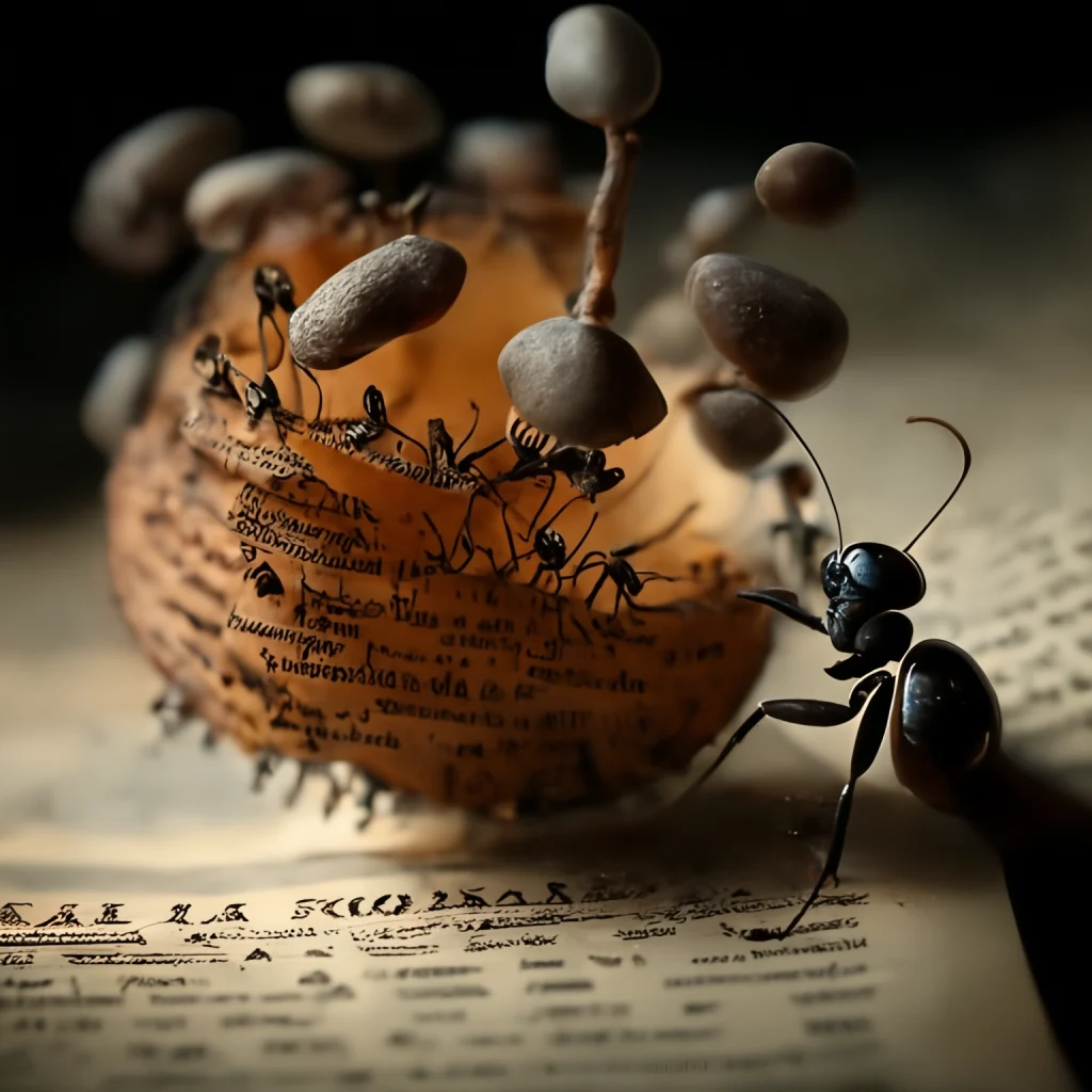 Die Samen waren mit Zeichen bedeckt, doch diese Zeichen sind vieldeutig, und ihre Deutung muss auf die Ameisenexistenz angewandt werden. Die Botschaft lautet offenbar: „Fresst die Eier! Nieder mit der Königin!“ Ein Aufruf zur Revolution, kein Zweifel. Denn der Autorin, die neben den Samen gefunden wurde, war der Kopf abgebissen worden…