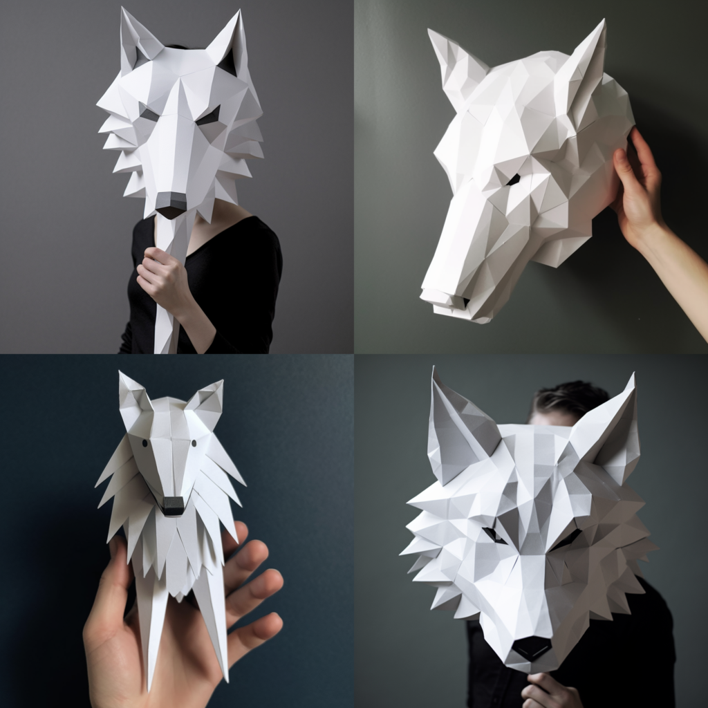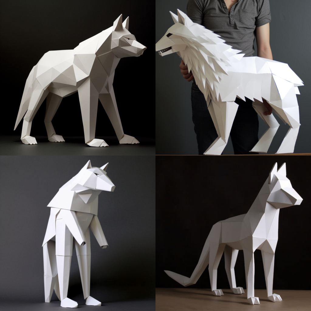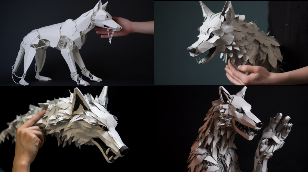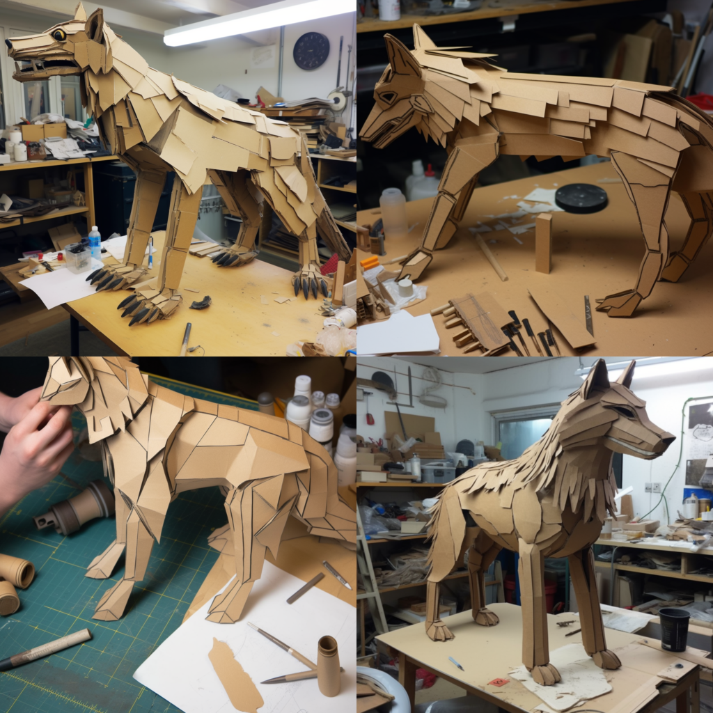 Midjourneys Version von einer aus Pappe gebauten Wolfsfigur. Selbst die Werkstatt ist artifiziell.