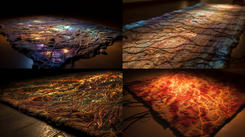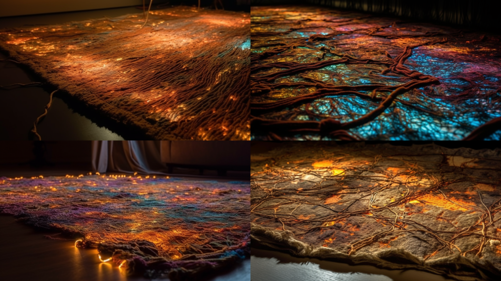 Midjourneys Version von einer aus Pappe gebauten Wolfsfigur. Selbst die Werkstatt ist artifiziell.